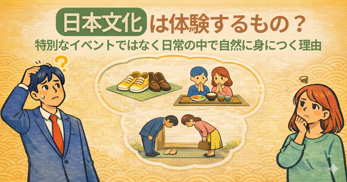 文化を意識して勉強するのではなく、同じような場面を何度も繰り返し経験する中で、自然と身体が動き、周囲と調和していく。この慣れこそが、日本人が文化を身につける最も一般的なプロセスです。